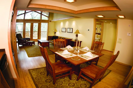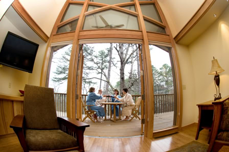 Eureka Springs Cabin-like private units, surrounded by nature. The architecturally significant Crescent Cottages offer luxurious accommodation and a connection to nature and renewal. Designed by architect Dave McKee, the cottages are two-bedroom units with large decks and a full living room/kitchen. Cottages are located within Crescent Park and adjacent to the Crescent Hotel. Crescent Cottages include breakfast at the hotel as well as privileges to all of the hotel amenities. Full kitchens, living and dining areas overlooking pristine woodlands of Crescent Park and trail access to the Harmon Park Loop. Trailside cottages have a hot tub.